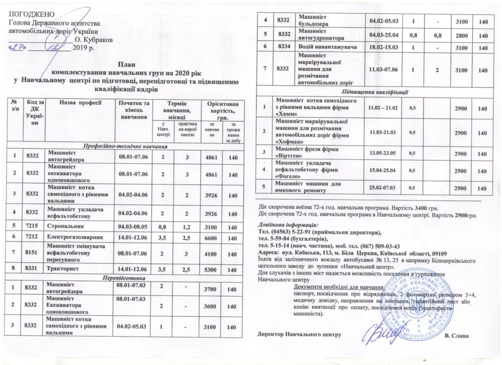 ПЛАН комплектування навчальних груп на 2020 рік у Навчальному центрі по підготовці перепідготовці та підвищенню кваліфікації кадрів